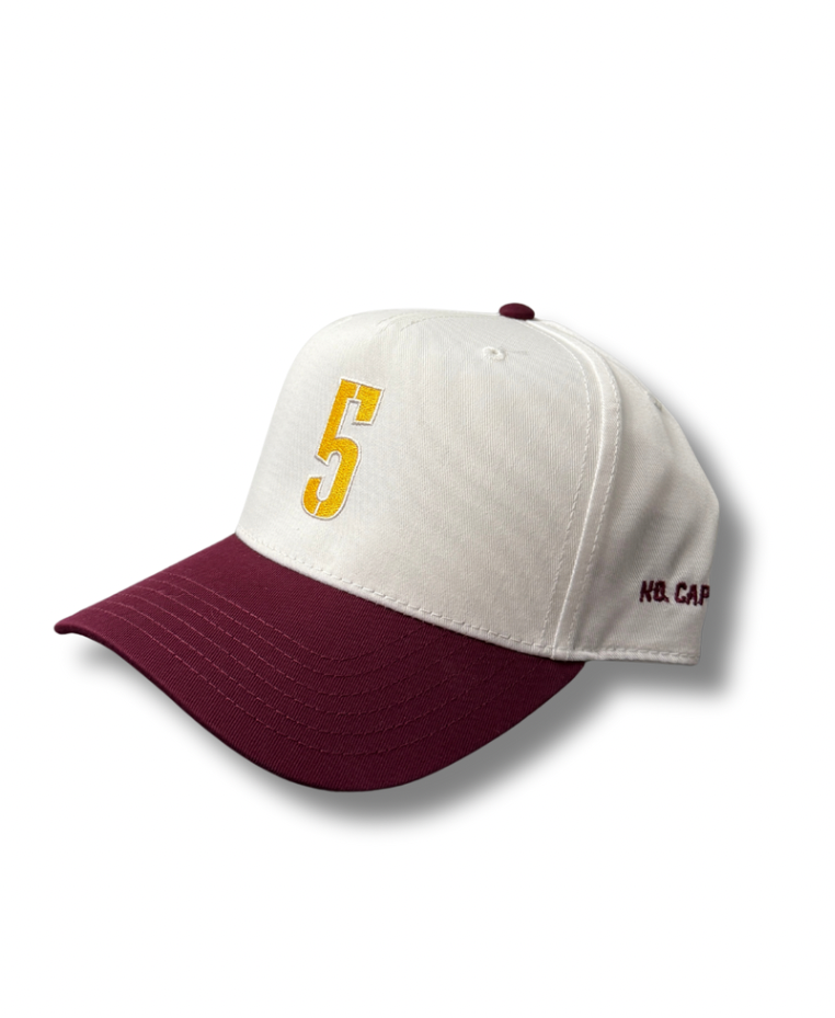 A white cap with a maroon brim and yellow 5